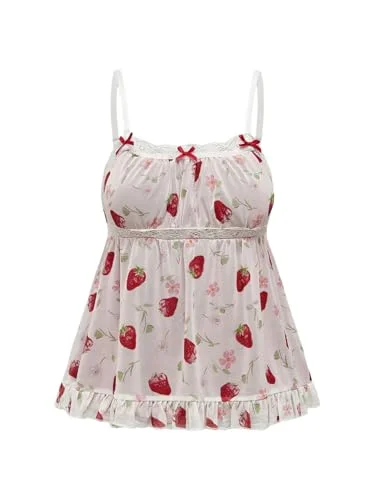 WDIRARA Women’s Plus Size Strawberry Print Cami Top showcases delightful features. This top combines a charming strawberry print with a mesh design and lace accents. Its ruffle hem and bowknot front add a playful touch, while the spaghetti straps provide a comfortable fit. Crafted from soft, breathable fabric, it ensures all-day comfort.