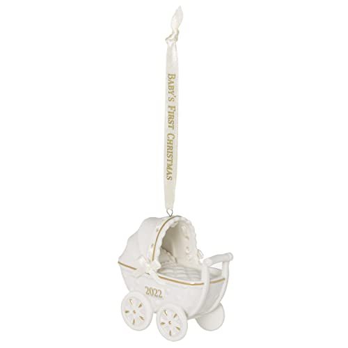 Hallmark Keepsake Christmas Ornament features a charming baby pram design crafted from porcelain. Gold accents and a satin ribbon hanger enhance its elegance. Measuring 2.6 inches wide, this ornament serves as a delightful reminder of a child’s first Christmas. The inscription ‘2022’ adds a personalized touch, making it a memorable addition to any holiday collection.